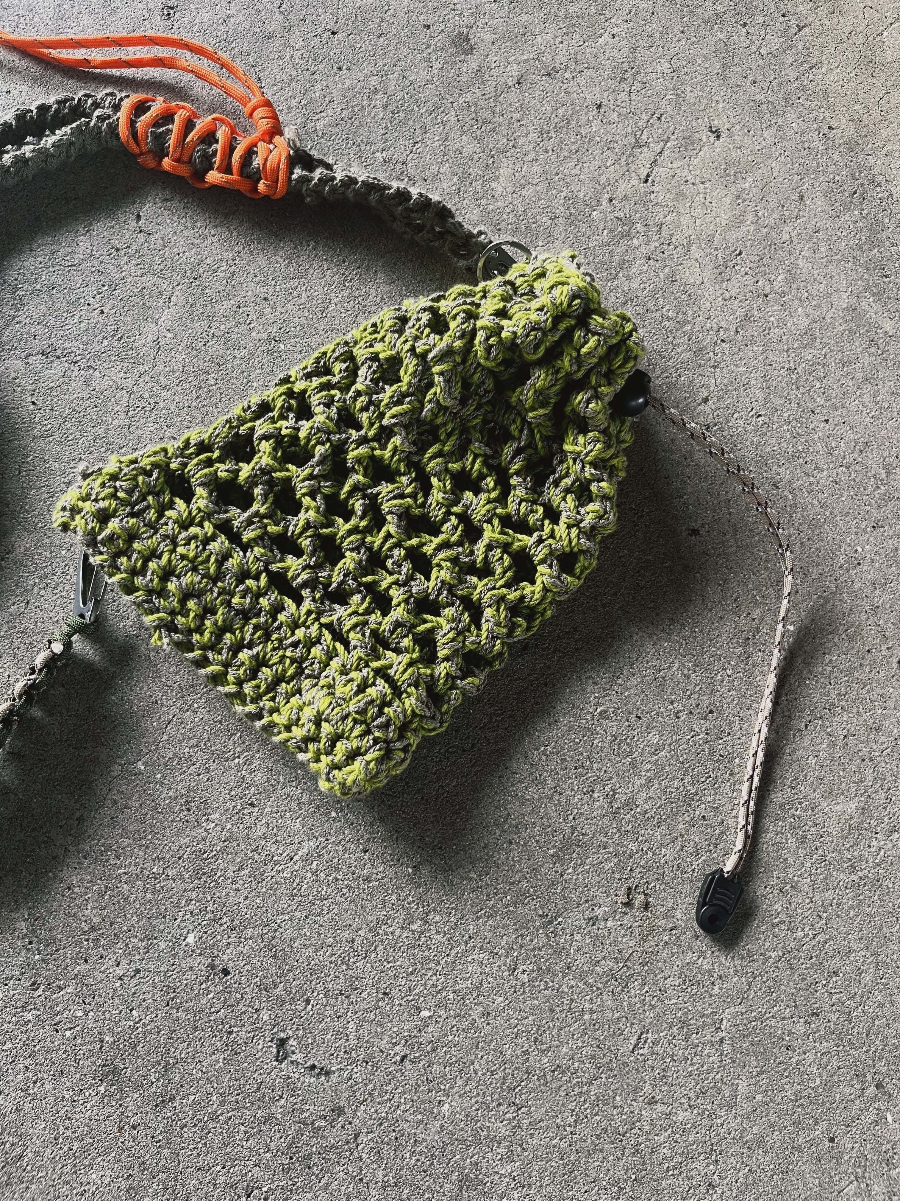 ハンドニットとパラコードを組み合わせたクロスボディバッグです。